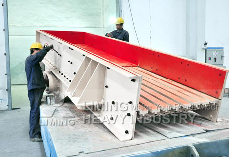 Notre alimentateur vibrant consiste en une alimentation à travers un vibrateur, ressort, moteur, etc. La source de vibration de l'alimentateur de matériaux est faite de deux manches (actif and passif) et d'un engrenage. Le manche principal est actionné par le moteur grâce au convoyeur en V, le manche passif commence à tourner à travers la maille d'engrenage du manche actif. Ensuite le manche contre rotatif force l'alimentateur à vibrer. Grâce à ces vibrations, les matériaux vont glisser et s'élinguer dans la cheminée remuant en arrière. Quand les matériaux passant dans le tamis, les plus petites particules vont tomber complétant le cycle.